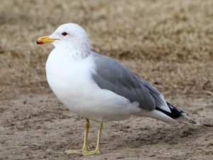 This medium-sized bird is similar in terms of appearance to the Herring Gull but has different colors. It has a smaller yellow bill with a black ring, yellow legs, brown eyes, and a more rounded head.